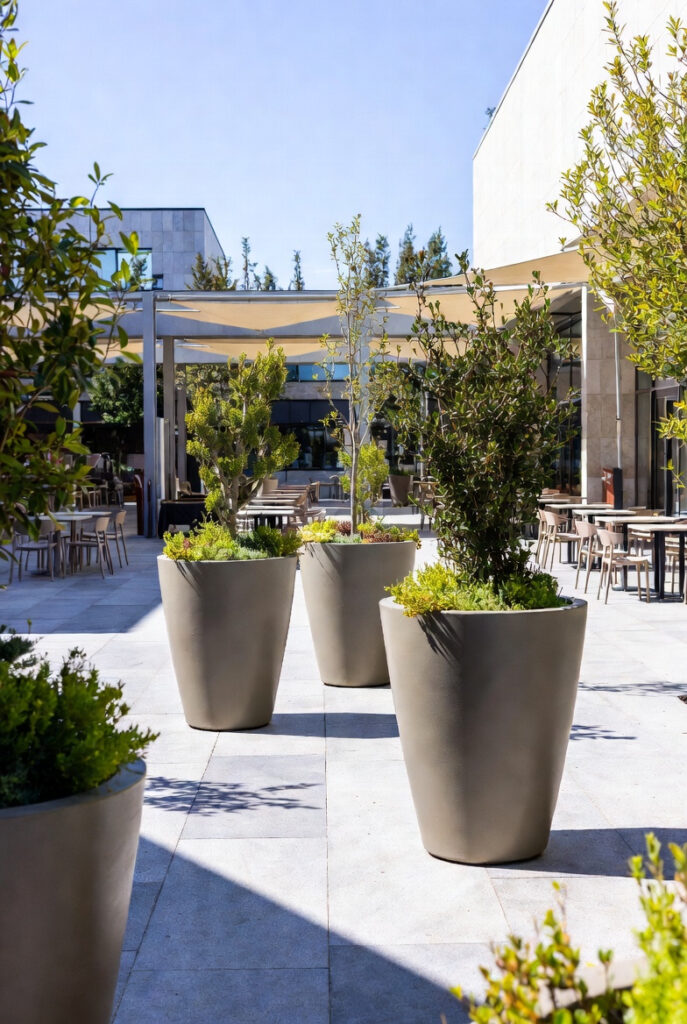 Açık avlu alanında, mimarinin sade çizgileriyle uyumlu geometrik saksılar kullanılarak düzenli ve ferah bir dış mekân kurgusu oluşturulmuştur. Bitkilendirme, hem dolaşımı yönlendiren hem de kullanıcıya sakin bir ortak alan hissi veren dengeli bir yeşil doku sunmaktadır.